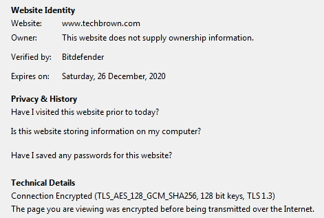 Open your web browser and hit on green padlock before https://www.techbrown.com . After hitting that see the information.